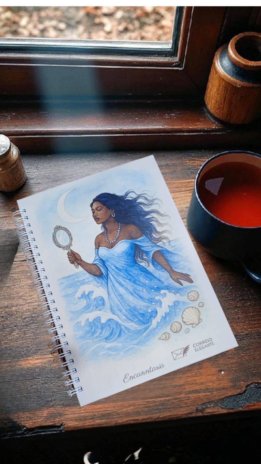 Este caderno traz a energia da Rainha das Águas, protetora e guia espiritual, em uma capa dura de iluminação fosca, resistente e sofisticada.